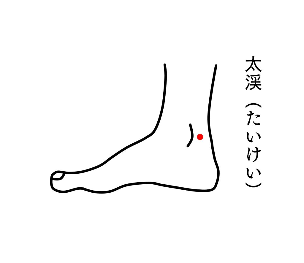 - 太溪(たいけい) …内くるぶしとかかとの間。腎経の要穴で耳症状にもよく用いる。