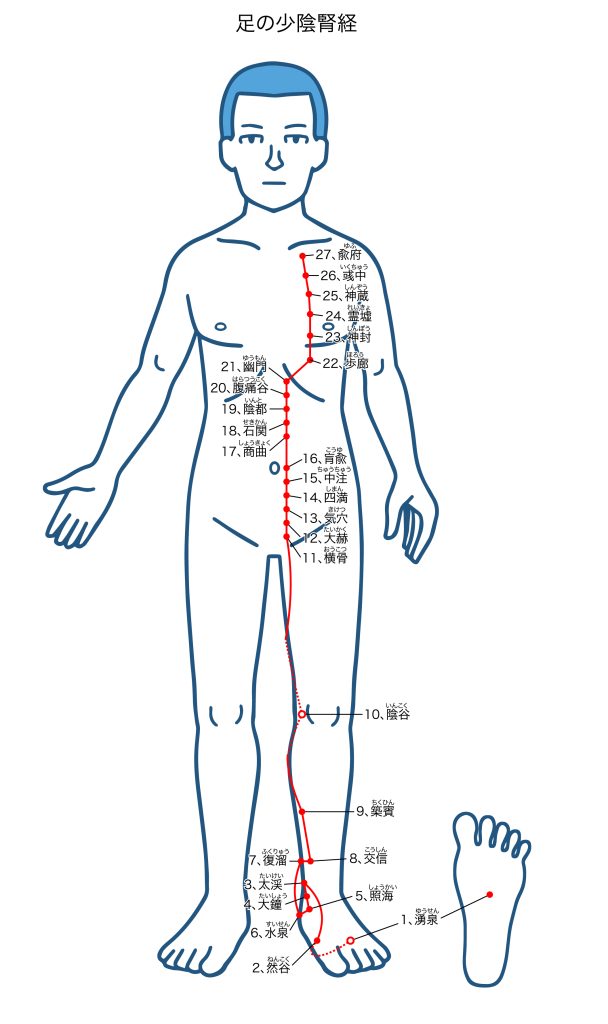 そこで腎経の経絡のはじまりである足裏やかかと周辺のツボを使用することが多いんです。