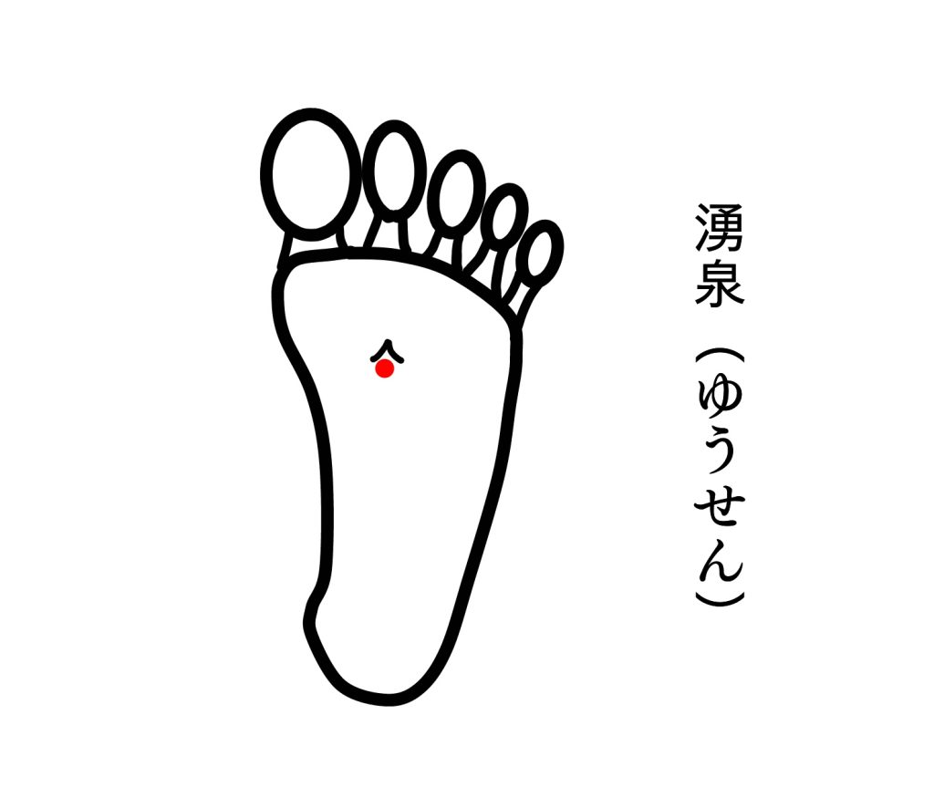 - 湧泉(ゆうせん) …足裏の中心、腎経の始まり。